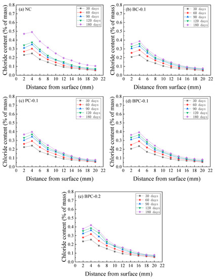 Chloride content distribution of the HBPRC: (a) NC; (b) BC-0.1; (c) PC-0.1; (d) BPC-0.1; (e) BPC-0.2.