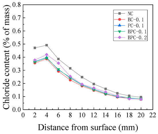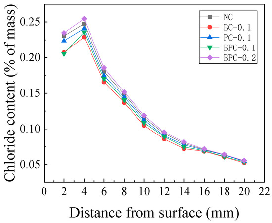 The chloride content distribution of the HBPRC after 30 days of erosion is depicted in Figure 4. It was found that the chloride penetration rate inside the concrete at the early stage of erosion could be reduced by blending fibres with a volume fraction of 0.1%; however, this reduction was not very remarkable and the magnitude of the reduction was affected by the type of fibre. The reduction effect of BF on the chloride penetration rate was greater than that of PF, while that of the hybrid BF–PF was in between. Taking the chloride content of the peak point as an example, the peak point chloride content of specimens BC-0.1, PC-0.1, and BPC-0.1 decreased by 7.9, 2.7, and 4.7%, respectively, compared with the control specimen NC. However, the peak point chloride content of specimen BPC-0.2 was 2.8% higher than that of specimen NC after 30 days of erosion. This result indicates that excessive blending of fibre increases the chloride penetration rate inside the concrete during the early stage of erosion.