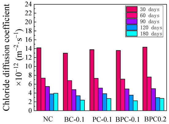 Specimen BPC-0.1 exhibited the lowest apparent chloride diffusion coefficient after 180 days of erosion, which was 43.1% lower than that of specimen NC. Although the variability in the experimental results cannot be excluded, these results are also explainable. According to El-Hamrawy’s study, PF with a low elastic modulus can bridge microcracks and delay the development of microcracks into macrocracks, while BF with a high elastic modulus can inhibit the expansion of macrocracks [7]. As a result, BF and PF form a complex fibre network, which can prevent the formation and development of sulphate attack microcracks more effectively than BF or PF alone.