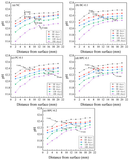 As indicated in Equations (7) and (9), the sulphate attack consumes Ca2+ in the concrete pore solution and generates readily soluble NaOH. Because the pH of the erosion solution is much lower than that in the concrete pore solution, NaOH gradually diffuses to the outside. This leads to a gradual decrease in the alkalinity of the concrete pore solution, which seriously affects the stability of the concrete matrix [44]. The pore solution pH distributions of the HBPRC after different erosion periods are depicted in Figure 7. It can be observed that the pore solution pH decreases with increasing erosion time for all groups of specimens, and the closer the location to the specimen surface, the more evident the decrease. In addition, as shown by the arrows in Figure 7, with the increase in erosion time, the area with a large pH change gradually moves to the interior of the concrete, which indicates that the influence depth of the sulphate attack gradually increases. However, because the penetration rate of sulphate in concrete is much slower than that of chloride [28,45], the development of the sulphate attack depth is relatively slow.