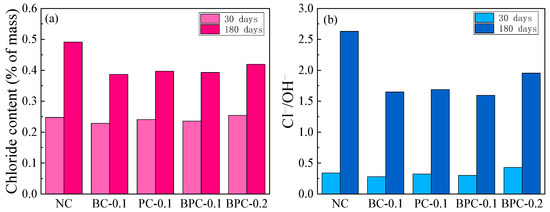 In the case of reinforced concrete structures, the decrease in alkalinity of the concrete pore solution also decreases the stability of the reinforcement passivation film, thus increasing the risk of reinforcement corrosion. It is well known that the molar ratio of free chlorides to hydroxide ions (Cl−/OH−) can be used to assess the corrosion potential of reinforcing steel in a chloride-containing environment [24]. In this context, it is clear that the blending of fibre has an effect on the variation in both chloride and hydroxide contents during erosion. For this reason, a comparative analysis of the influence of fibre on the variation in chloride content and Cl−/OH− ratio was performed. Similarly, taking the location of 4 mm from the surface as an example, the chloride contents and Cl−/OH− ratios of the HBPRC after 30 days and 180 days of erosion are illustrated in Figure 8. As shown, the growth rate of Cl−/OH− ratio is much higher than that of the chloride content for all specimens. For example, the Cl−/OH− ratio of specimen NC after 180 days of erosion is 7.7 times higher than that after 30 days of erosion, while the chloride content increases by only approximately two times. This result shows that sulphate severely affects the risk of reinforcement corrosion. First, it causes cracking of the concrete matrix, which increases the rate of chloride penetration. Second, it decreases the alkalinity of the concrete pore solution, which further increases the risk of reinforcement corrosion.