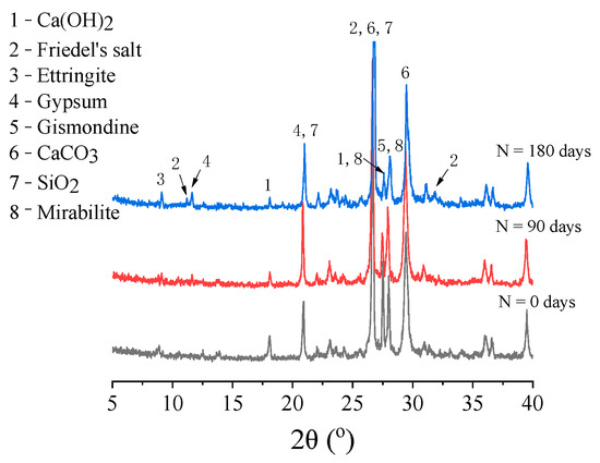 The XRD patterns of specimen NC after different erosion periods are displayed in Figure 9. As shown, the crystalline phases of the HBPRC are mainly Ca(OH)2(CH), Friedel’s salt, ettringite, gypsum, gismondine, CaCO3, SiO2, and mirabilite. In this study, the focus is on the transformation of the hydration products and the variations in the Friedel’s salt, ettringite, and gypsum.