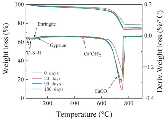 The TG and derivative thermogravimetric (DTG) curves of specimen NC after different erosion periods are depicted in Figure 10. Three weight loss peaks can be clearly observed in the DTG curve. The weight loss peak at 50–80 °C is mainly due to the evaporation of bound and free water from the hydration products (e.g., C–S–H gels) [50]. The second weight loss peak is located at 420–460 °C, which corresponds to the decomposition of CH. It can be observed from Figure 10 that the CH weight loss peak almost disappears after 30 days of erosion, which implies that the CH has been consumed in large amounts. The weight loss peak at 750–850 °C corresponds to the decomposition of calcium carbonate. In addition to these three obvious weight loss peaks, after 180 days of erosion, there are weight loss peaks at 90–110 °C and 130–140 °C, which correspond to the heat uptake peaks of ettringite and gypsum dehydration, respectively [51]. Moreover, as described in Section 3.4, the presence of sulphate reduces the stability of Friedel’s salt. Therefore, the weight loss peak of Friedel’s salt (heat absorption peaks for the evaporation of free water in the intercalated space between 120 and 140 °C and heat absorption peaks for the weight loss from dehydroxylation between 286 and 322 °C) is not significant. Generally, the results of the TG/DTG analysis are in good agreement with those of the XRD analysis.