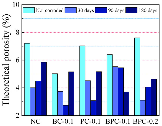 Compared with the initial porosity, the porosity of the HBPRC decreases by 13.49–59.24% after 30 days of erosion. However, it should be noted that the change in porosity is not only caused by the corrosion products filling the pores. According to Haga et al. [52], the dissolution of CH in concrete would lead to an increase in the pore volume with a diameter of a few micrometres, while the dissolution of C–S–H would lead to an increase in the pore volume with a diameter of less than 100 nm. Additionally, microcracks generated by excess corrosion products increase the porosity of concrete [53]. Therefore, the change in porosity is the result of the combination of these three factors, that is, when the pore volume reduced by the corrosion products () is greater than that increased by the CH and C–S–H dissolution and corrosion-generated microcracks (), the porosity decreases; when is smaller than , the porosity of concrete increases. This shows that the change in porosity is dominated by during the first 30 days of erosion. However, after 30 days of erosion, the change trend in the porosity of each group differs. As can be seen from Figure 11, the porosity of specimen NC decreases to its lowest value after 30 days of erosion. Then, the porosity increases rapidly, implying a rapid increase in the corrosion of specimen NC, with beginning to dominate the porosity change. This result clearly explains the increasing trend of the chloride diffusion rate in specimen NC at the late stage of erosion. Compared with specimen NC, the addition of 0.1% BF, PF, and hybrid BF–PF delayed the corrosion age at which the concrete porosity started to increase. The porosities of specimens BC-0.1 and PC-0.1 started to increase after 90 days of erosion, while that of specimen BPC-0.1 did not show a decreasing trend until 180 days of erosion. However, in contrast to the specimens with 0.1% fibre blending, the 0.2% hybrid BF–PF was not effective in retarding the age of erosion at which porosity starts to increase. Similar to specimen NC, the porosity of specimen BPC-0.2 started to increase after 30 days of erosion. This is probably because excessive fibre incorporation reduces the dispersibility of the fibre, which leads to easy clumping and folding of the fibre, thereby preventing full utilisation of its function.