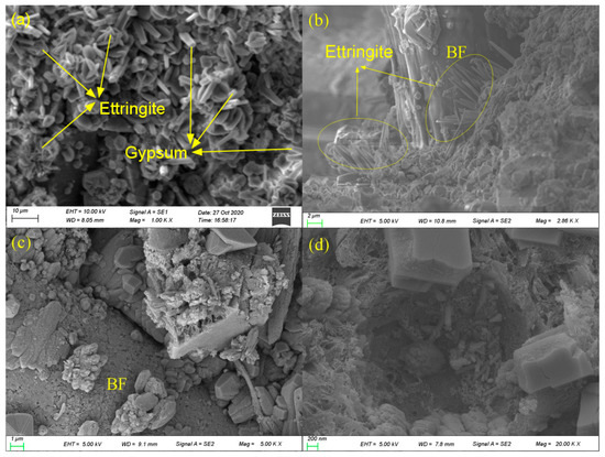 The microscopic morphology of the HBPRC after 180 days of erosion is displayed in Figure 14. Figure 14a reveals the presence of a large amount of columnar gypsum and needle-like ettringite in the HBPRC after 180 days of erosion, which is in accordance with the XRD and TG results. Figure 14b,c show that a large amount of corrosion products filled the fibre-matrix ITZ, and the needle-like ettringite provided an anchoring effect between the fibre and matrix, which improved the mechanical bite force between the fibre and the matrix. At the same time, the corrosion products also decreased the porosity of the fibre-matrix ITZ, thus reducing the adverse effect of the fibre-matrix ITZ on the chloride attack resistance of concrete. Figure 14d indicates that a large amount of corrosion products filled the pores inside the concrete. Owing to the filling effect of corrosion products on both the fibre-matrix ITZ and the pores, the porosity of concrete decreased significantly during the erosion process; hence, the apparent chloride diffusion coefficient of the HBPRC gradually decreased in the short term.