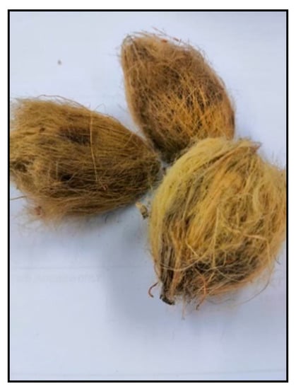 In this experiment, arecanut husks were subjected to pyrolysis. Arecanut waste (Figure 1) was collected from a local farm in Selangor, Malaysia. The husk was cleaned by distilled water and dried up in the oven at 70 °C for 24 h. This precaution step was carried out to avoid any contamination, removed the unwanted residues, and kill all the insects that have been living in the husk. After that, the husk was burned in the electrical furnace at 700 °C, 800 °C, and 900 °C to determine the optimum temperature needed to extract the highest percentage of SiO2 from arecanut husk. Furthermore, the powder was then sieved into fine powder of approximately 45 μm.
