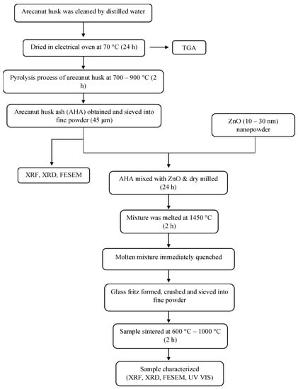 In this work, thermogravimetry analysis (TGA) was carried out by using a Mettler Toledo TGA/DSC 1HT (Mettler Toledo, Küsnacht, Switzerland) to determine the thermal stability of the arecanut husk in the presence of oxygen gas. Quantitative measurement of the sample’s elemental composition was carried out using X-ray fluorescence (XRF) XRF-EDX-720/7000 spectroscopy (Shimadzu, Kyoto, Japan). Furthermore, the phase identification of the sample was analysed by using X-ray diffraction (XRD) Phillips X’Pert High Pro PANanalytical Diffractometer (Malvern PanAnalytical, Almelo (Netherland), and Malvern (UK)). The morphological structure of the sample was observed under the field emission scanning electron microscopy (FESEM), Nova NanoSEM 30 (FEI, Hillsboro, OR, USA) under 25,000× magnification level. In addition, the absorbance properties of the sample were analysed by UV-3600 Shimadzu (Shimadzu, Kyoto, Japan). The overall methodology of the experiment is illustrated in Figure 2.
