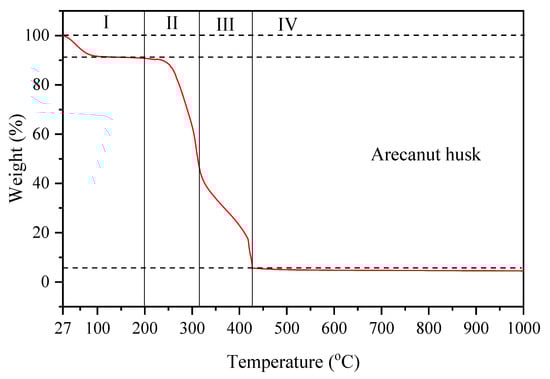 Thermal analysis of the arecanut husk was conducted by using thermogravimetry analysis (TGA) at a temperature range of 27–1000 °C. A graph of temperature against weight was plotted as shown in Figure 3. The percentage of weight loss at each stage can be determined from the plotted graph. The initial stage (I) of the weight loss corresponds to the release of moisture from the arecanut husk. At this stage, about 8.97% of the total weight of arecanut husk decomposed due to loss of water content and light volatile compounds [10,11,12]. Afterward, the second stage (II) of weight loss occurred in the range of 200 °C–315 °C. Above 200 °C, the thermal resistance of agriculture waste gradually [13]. About 44.50% of the weight of AH was loss at this stage due to the decomposition of hemicellulose [14]. Stage (III) occurred at temperature between 315 and 430 °C and the arecanut husk undergone about 40.77% weight loss, which is associated with the decomposition of cellulose. Stage (II) and (III) of the TGA graph undergone rapid weight loss was due to the devolatilization of organic compounds of hemicellulose and cellulose [11,15]. Decomposition of hemicellulose occurred at a lower temperature (180–340 °C) and cellulose (230–450 °C) [14]. At this stage (IV), AH produces about 5.76% of ash after the pyrolysis process. The stabilization of mass loss for AH at stage (IV) specifies the complete burning process of volatile components and proposes a temperature above 600 °C for the pyrolysis process for char formations. To sum up, the TGA was carried out and the weight degradation analysis of the AH was discussed and deemed suitable to be used in this work.
