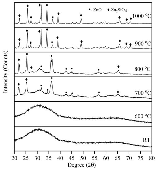 The crystalline or amorphous nature of the samples was analysed using XRD. Figure 5 consists of XRD patterns of the sample sintered at various sintering temperatures from 600 °C to 1000 °C for 4 h. The unsintered glass sample (RT) was presented with no diffraction peaks, which indicate the amorphous nature of the sample. Besides, at 600 °C, the sample was still in amorphous structure due to the low sintering temperature that does not induced the crystal growth of the sample. The crystalline process begins at temperatures higher than 700 °C. It was noticed that the characteristics peak of the sample at this temperature shows the lowest intensity that indicated the sample has poor crystallinity. Three major peaks appeared indicating the presence of Zn2SiO4 and according to Inorganic Structural Database (ICSD) no. 00-037-1485, the Zn2SiO4 has an orthorhombic crystal structure same reported in previous research [18,19,20,21]. Besides that, diffraction pattern that resembled ZnO (ICSD 00-036-1451) was also found at this temperature.