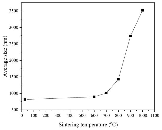 FESEM analysis was performed to study the shape, size, and morphology of the Zn2SiO4 samples. FESEM microstructures of the sintered samples are presented in Figure 6a–f under magnification of 25,000×. From the FESEM micrographs, it was observed that the prepared sample was not uniform and consisted of irregular particle size distribution with the average grain sizes of 813 nm. After sintered at 600 °C, the sample was observed to gain in sizes with the average grain sizes measured to be 895 nm. When the sintered temperature increased to 700–1000 °C, the morphology of the Zn2SiO4 glass-ceramic became granular and show more homogeneous distribution [26]. Furthermore, samples sintered at 700 °C to 1000 °C showed larger grain sizes with an increase in sintering temperature measured from 1011 to 3518 m. Thus, it is confirmed that the grain size of the samples showed increasing trends as the sintering temperatures increased due to the increase in its growth rate and crystallinity [27,28]. The relations between sintering temperature and the average grain sizes of the samples are illustrated in Figure 7.