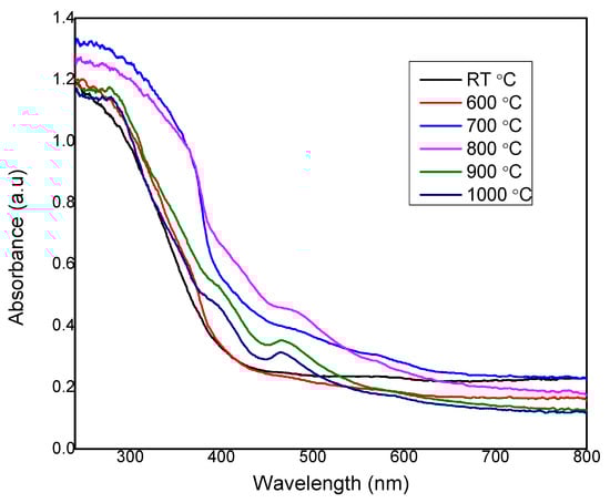 The absorbance spectrum of zinc silicate sintered at different sintering temperatures of RT, 600, 700, 800, 900, and 1000 °C.