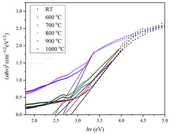 where α is the absorbance coefficient, h is plank constant, v is the frequency, n is the transition, and Egap is the optical band gap [32]. In this work, n = ½ was inserted into Equation (2) to form Equation (3)