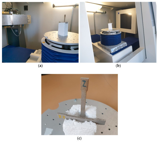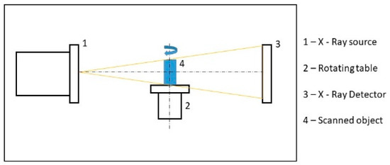 Three dimensional models were evaluated in the VGStudio MAX 3.0 software (Volume Graphics, Heidelberg, Germany) after reconstruction. The first step was surface determination for recognition of the shape of the part. After that, 2 × compatibility porosity analysis was used. Its application shows pores scanned in each part. The principle of non-destructive measurement by CT is shown in (Figure 3). The position of the parts located in the computed tomography device is shown in (Figure 4).