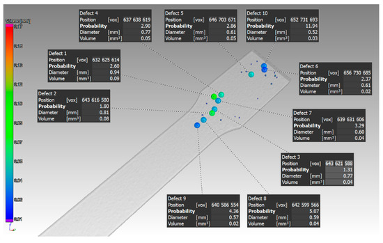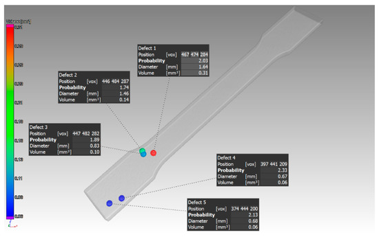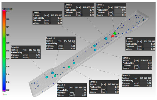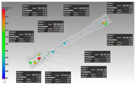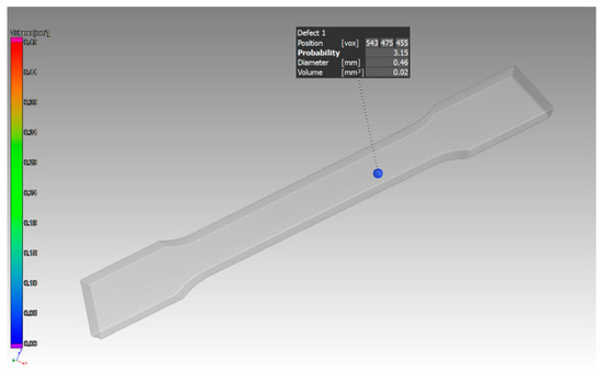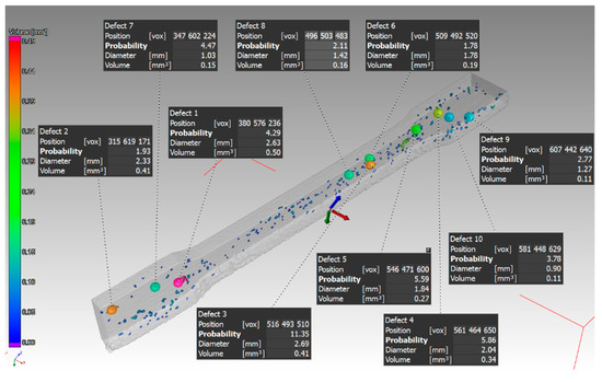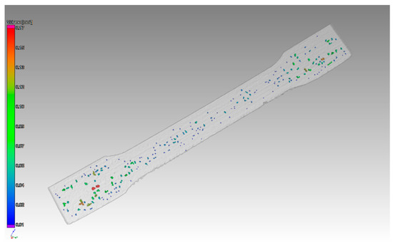 The last experiments were performed on the samples with a thickness of 3 mm. The orientation of the parts in the machine during their production was in the Z direction and in the XZ direction. In the part oriented in the Z direction, essentially only one pore with a diameter of 0.46 mm was identified (Figure 15). The defect volume ratio was 0.00%. As it was with the previous samples oriented in the XZ direction, the pores in this part were distributed throughout the entire volume of the part. Again, pores of different sizes identified in this sample are shown in (Figure 16). The evaluated defect volume ratio was 0.54%.