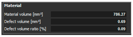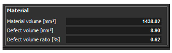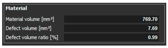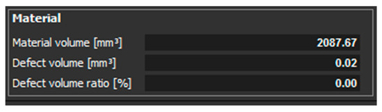 Figure 13 shows the measured values of material volume, defect volume, and defect volume ratio for the sample with thickness of 2 mm, which was oriented in the Z direction. The measured values for the sample oriented XZ are shown in Figure 14.