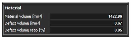 Figure 10 shows the measured values of material volume, defect volume, and defect volume ratio for a sample, which had 1 mm thickness and was oriented XZ.