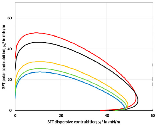 Based on the values of the dispersive and polar components, the so-called wetting envelope of a polymeric film’s surface properties was calculated. The wetting envelope is the fastest method that predicts the wetting behaviour of the liquids on the substrates. A wetting envelope is plotted when the polar and dispersive parts of the substrate’s surface free energy are known. Figure 3 shows the wetting envelopes for the obtained starch-based films. It can be seen that the wetting envelopes of the films made from potato, tapioca, and oat starch were comparable. Furthermore, the wetting envelope of the maize starch-based film (red line) exhibited a larger area than the other investigated starches.