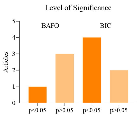 Comparison of the statistic value p. between the conventional technique of implant site preparation and technique with the use of drills for osseodensification. Parameters used BAFO (considered in 4 studies of 11) and BIC (considered in 6 studies of 11). For p < 0.05 we considered statistically valid the favorable results obtained by the osseodensification technique compared to the conventional technique.