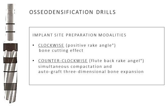 - Elsayyad, A.A.; Osman, R.B. Osseodensification in Implant Dentistry: A Critical Review of the Literature. Implant Dent. 2019, 28, 306–312. [Google Scholar] [CrossRef]