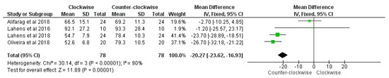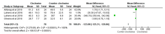 The meta-analysis procedure demonstrated a significantly higher BIC percentage between the counter-clockwise group compared to the clockwise group was present (overall effect: p < 0.01; Z: 108.53; heterogeneity: p < 0.01; χ2: 21279.89, df:3; I2: 100%) (Figure 12).