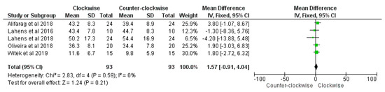 No significant difference of histomorphometry BAFO percentage between the counter-clockwise group compared to the clockwise group was reported (overall effect: p = 0.21; Z: 1.24; heterogeneity: p = 0.59; χ2: 2.83, df:4; I2: 0%) (Figure 14).