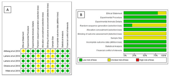 The risk of bias measurement was conducted on all studies included for the meta-analysis and summarized in Figure 15A,B, where a total of five studies on animals showed a low risk of bias [66,68,70,74,75].