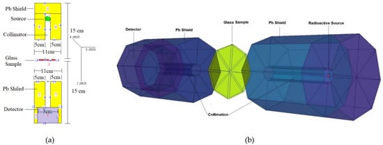 This can be clarified by the form of processes and physics used in the Monte Carlo simulation and random event generator for a radiation-transfer method, whereas WinXcom is a mechanism that utilizes mathematical improvement for direct determination of MACs. It is worth noting that the MCNPX does not explicitly record MAC values. In some instances, some data processing is achieved by looking at performance data. Simulations were created by integrating various details, including information such as input files, cell cards, and source. The glass samples were measured in terms of their elemental mass fractions (weight per unit length), and dimensions (cm). The gamma-ray-emitting systems’ total geometry can be seen in Figure 2. In this step, the F4 Tally mesh was directly utilized for detection of attenuated gamma rays. In this tally mesh, the total photon flux in a cell was determined. Finally, it is worth mentioning that a point radioactive isotope was utilized as a source for incident gamma rays. The simulation process was repeated from 0.015 to 15 MeV for each glass sample. Moreover, a well-known variance-reduction technique known as tracking optimization was utilized. To increase simulation efficiency, neutron and electron tracking were set as off, and only photon tracking was allowed in the cell definition (i.e., IMP: P).