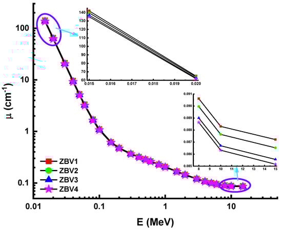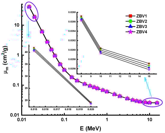 To determine the nuclear-radiation-shielding dynamics of V2O5-reinforced ZnO-B2O3 glasses, in silicon Monte Carlo simulation studies were performed. Accordingly, four separate glasses encoded as ZBV1, ZBV2, ZBV3, and ZBV4 based on a (100−x)(0.6ZnO-0.4B2O3)(x)(V2O5) (x = 1, 2, 3, 4 mol. %) glass system was checked for their potentials as possible materials for nuclear-radiation-shielding implementations. In this study, we used Monte Carlo simulations and Phy-X PSD [53] code for determination of shielding parameters. First, linear-attenuation coefficients (LACs) were determined between 0.015–15 MeV gamma photon energy. Figure 3 depicts the variation in the linear attenuation coefficients (µ) against photon energy for all glasses. Figure 3 shows that the influence of the photoelectric effect, Compton scattering, and pair production processes on the LAC was variable depending on the incident energy zones (i.e., low, middle, and high energy). This finding follows as a result of the association of radiation with matter. At low energy values, the LAC is lost due to photo adsorption. Compton scattering accounted for the majority of the energy difference at the mid-energy area, while the lowest LAC was reported in the ZBV4 sample. In other words, the ZBV4 sample with the highest amount of V2O5 additive showed the lowest LAC values. In contrast, the ZBV1 sample showed the highest LAC values. In the low-energy region, LAC values were quite similar, whereas in the high-energy region, the differences were slightly higher. The importance of density and direct LAC relationship with density were dominant factors (Figure 3). The mass-attenuation coefficient (MAC) of a material is a specific parameter that can be used in terms of density-independent categorizations of studied shielding materials. Figure 4 illustrates the variations in the mass-attenuation coefficient (µm) against incident photon energy for all glasses at 0.015–15 MeV. The chemical structure of the attenuator glass altered the rate of variation of the calculated MAC values. The mathematical analysis of the MAC data show patterns in distinct regions. In the low-energy condition, in which the photoelectric effect is important, the absorption dramatically decreased. Compton-scattering superiority showing the total decrease from the MAC at the mid-energy region. The ZBV1 sample displayed very high atomic concentrations at all incident photon energies. The situation in both the low- and high-energy areas can be clarified by the presence of the highest volume of zinc (Z = 30) in the glass structure, since it has a significant atomic number among the utilized composition elements (i.e., B, O, V, Zn).