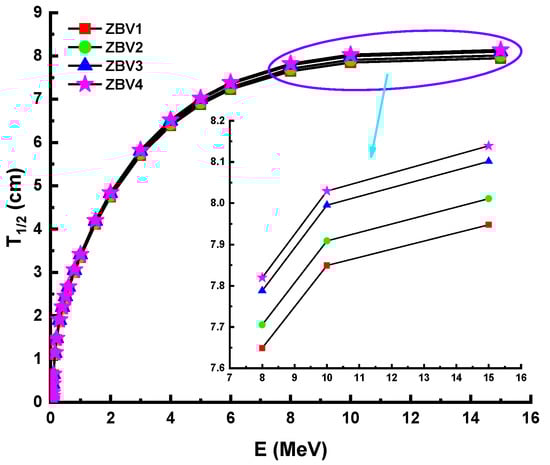 HVL, which stands for “half-value layer” (T1/2), is a valuable amount when measuring the thickness of a shielding material in order to minimize gamma rays. So, a smaller HVL may serve as a measure of a material’s capacity to shield incident gamma rays from a primary source. Using the calculated LAC values, the HVLs of the studied glasses were calculated. Figure 5 demonstrates the association between photon energy and T1/2 for all glass samples. In the low-energy spectrum, calculations of HVL values were reported smaller. This is a predictable result for shielding in materials that low-intensity gamma rays cannot move through almost completely. To learn more about the efficiency of the studied materials as gamma-ray absorbers, we found it useful to compare them with some of the materials most commonly used as shields against gamma rays. The HVL value for the best glass sample (ZBV4 = 8.13915 cm) at 15 MeV was compared with other shielding materials (lead= 1.08069 cm, ordinary concrete = 13.89992 cm, HSC = 11.63975 cm, ILC = 9.40269 cm, IL = 7.81848 cm, G1 = 15.25284 cm, and G2 = 10.53327 cm) glasses [54,55]. The comparison shows that the ZBV4 glass came third after lead, and with IL outperforming the other shield types. Considering its other distinguishing features, such as lack of toxicity risk and lower weight, this glass is recommended as the ideal choice in many applications that require gamma-ray shields with specific properties.