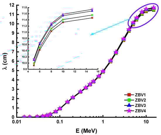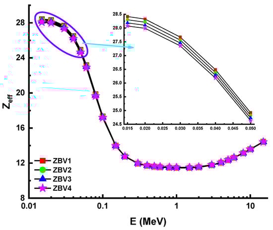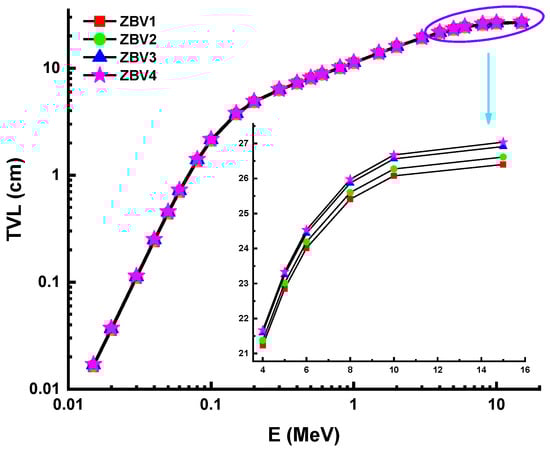 However, Figure 5 shows that the HVL values were greater in the mid- as well as the high-energy field. This was attributed to the penetration property of gamma rays and how it changes with higher energy levels. Considering the direct impact of material densities, which were reported as 3.392 g/cm3, 3.371 g/cm3, 3.339 g/cm3, and 3.329g/cm3 for ZBV1, ZBV2, ZBV3, and ZBV4, respectively, the HVL values were changed in similar order. For example, HVL values of 1.109 cm HVLZBV1 < 1.121 cm HVLZBV2 < 1.136 HVLZBV3 < 1.143 cm HVLZBV4 were reported at 0.15 MeV. The initial difference in HVL values was 0.034 cm at 0.015 MeV. To confirm the previously mentioned interpretation of the changing trend of HVL values depending on energy region, it is favorable to order those HVL values in the high-energy region. Thus, 7.948 cm HVLZBV1 < 8.011 cm HVLZBV2 < 8.101 cm HVLZBV3 < 8.139 cm HVLZBV4 were also reported at 15 MeV. In this case, the difference in HVL values was 0.191 cm at 0.015 MeV. Therefore, one can say that the negative effect of V2O5 on HVL values was slightly lower at low energies. Accordingly, the aforementioned reinforcement type negativity can be tolerated at low energy values, considering the positive effects on optical, structural, and thermal properties. The effect of the mean free path (λ) is critical in the capacity of shielding materials to defend against gamma radiation. Glass samples were analyzed in terms of λ values, and details are summarized in Figure 6. The λ values can fluctuate, similar to the shifting patterns in the HVL. The λ values of ZBV1 have been recoded as the minimum in the investigated energy range. Another main element to remember is the tenth-value layer (TVL). The TVL element is another critical criterion to verify the thickness of shields, minimizing gamma rays’ strength to 1/10 of their original intensity. The TVLs of the studied samples were calculated, and a graph was drawn showing their importance against incident photon energy (Figure 7). In the lower-energy ranges, the TVL values were lower. Similar to the changing trend in HVL values, TVL values were registered as 3.685 cm HVLZBV1 < 3.722 cm HVLZBV2 < 3.772 cm HVLZBV3 < 3.797 cm HVLZBV4 at 0.15 MeV. The effective atomic number (Zeff) of a substance used for gamma-ray exposure regulation would contribute to its photon-attenuation properties. The variation of effective atomic number (Zeff) against photon energy for all glasses is shown in Figure 8.