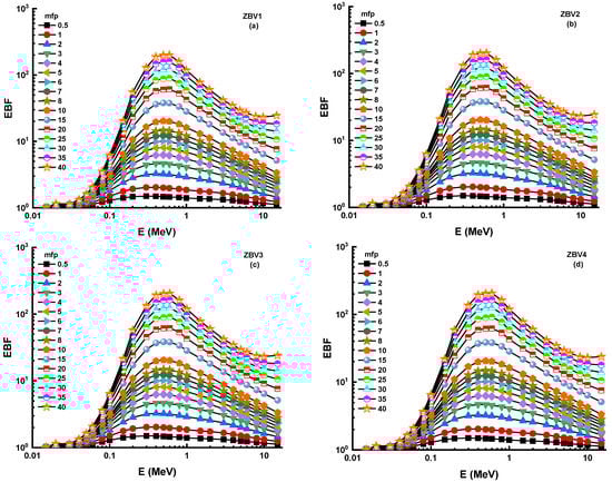The Zeff values for ZBV1 glass were the best. For example, a Zeff value of 14.01 was found for the ZBV1 sample at 0.15 MeV. However, the maximum Zeff values recorded for samples were 28.42, 28.30, 28.19, and 28.07 for ZBV1, ZBV2, ZBV3, and ZBV4, respectively. The average photon flux was measured in the detection field by using an F4 tally mesh (Figure 2). Then, an absorption coefficient was used to compensate for a scattering of the radiation. Excess radiation required the cumulative measurement of radiation buildup. The attenuation component was multiplied by the photon’s attenuation rate to measure the photon’s overall attenuation. The moderator attenuates the penetration of photons of varying intensities such that they both achieve the same reception. In this case, buildup factors can be classified as exposure buildup factor (EBF) and energy-absorption buildup factor (EABF).