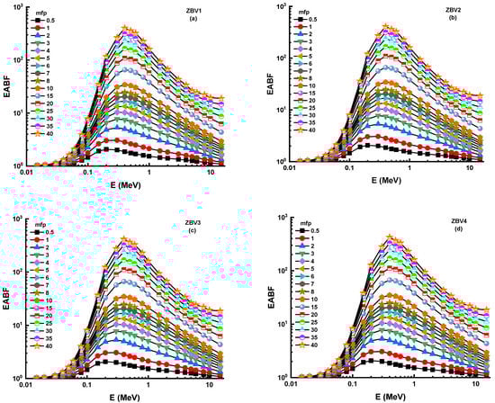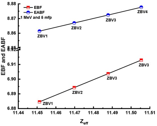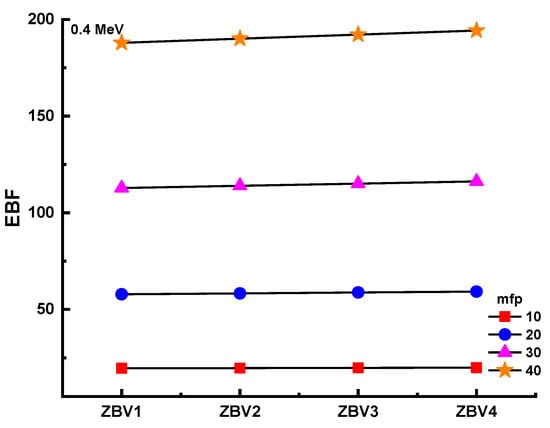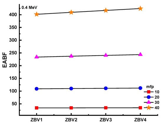 Figure 11 and Figure 12 show the differing energy-absorption buildup factors (EABF) and exposure buildup factors (EBF) at 0.4 MeV along with 10, 20, 30, and 40 mfp values for all glasses. It can be seen that the ZBV1 sample showed the minimum EBF and EABF values at the studied mfp values. From ZBV1 to ZBV4, EBF and EABF values showed an increasing trend. This can be explained by decreasing gamma-ray-attenuation competencies with a V2O5 reinforcement amount from 1 to 4 mol.%. As a last analysis of EBF and EABF values, Figure 13 shows the variations in the energy-absorption buildup factor (EABF) and exposure buildup factor (EBF) against effective atomic number (Zeff) for all glasses at 1 MeV/5 mfp. This is another sign of the synergistic effect of V2O5 reinforcement, which caused a decrement in densities of glasses, and in gamma-ray-shielding competencies accordingly. As illustrated in Figure 13, EBF values increased gradually from ZBV1 to ZBV4. This trend was a natural consequence of variations in effective atomic numbers, which was discussed in previous sections.