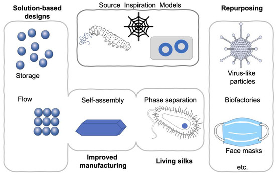 Summary of emerging silk material trends. Repurposing [23,25,27,28], solution-based designs [24], phase separation [30,31] and flow [22,26,29] impacting manufacturing and creating living materials.