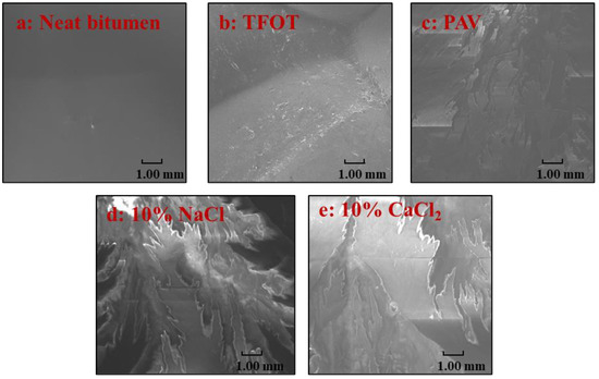 Figure 1 presents SEM images of five bitumen samples under original, TFOT, PAV, 10% NaCl, and 10% CaCl2 conditions. Some differences can be observed from Figure 1a–c: after TFOT aging, the surface bitumen was rougher with some smaller particles than that of neat bitumen, and these particles were accumulated by large molecules within bitumen; however, the surface of bitumen was cracked and with separated pieces of bitumen after PAV aging. Thus, the thermal oxidation aging increases the proportion of large molecules, resulting in a rough surface with a few cracks [30]. However, from Figure 1a,d,e, salt solution aging induced different changes in the bitumen surface compared to thermal-oxidative aging. Sharp angles of bitumen pieces were observed for salt solution aged bitumen. This result could be attributed to the fact that that salt solution aging would deteriorate the outmost layer of bitumen or lead to residual salt on the bitumen surface, which leads to the loss of bitumen pieces and sharp angles [31]. Thus, bitumen aged by thermal-oxidative aging (TFOT and PAV) showed different phenomena on the morphology of bitumen compared to salt solution aging.
