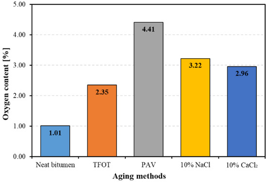 Figure 2 shows the oxygen content of neat bitumen and aged bitumen. The oxygen content in bitumen is one of the most important factors indicating the aging degree of bitumen. The higher oxygen content indicates the more severe aging of bitumen [32]. From Figure 2, it can be seen that the oxygen content of bitumen increased to different extents after four kinds of aging methods were applied. PAV aging led to the most severe aging on bitumen, since the oxygen content of PAV aged bitumen was the highest among four kinds of aged bitumen. The 10% NaCl and 10% CaCl2 had similar effects on bitumen aging. TFOT aging has the least effect on bitumen aging, as the oxygen content of TFOT aged bitumen was slightly higher than that of neat bitumen. Therefore, both thermal-oxidative aging and salt solution aging would increase the oxygen content within bitumen, resulting in the more severe aging of bitumen. However, the aging severity of bitumen is dependent on the aging time and aging mechanisms.