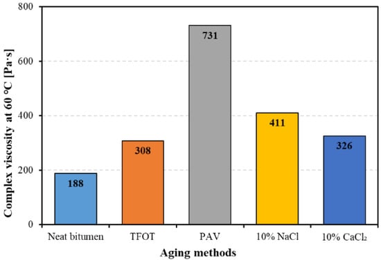 Figure 5 shows the complex viscosity of bitumen at 60 °C with and without aging. It is obvious that all aging methods increased the complex viscosity of bitumen. Among the five kinds of bitumen, PAV aged bitumen has the largest complex viscosity, which is almost four times that of neat bitumen and twice that of the other three aged bitumen. Salt solution aged bitumen showed a slightly higher value than TFOT aged bitumen. The above results demonstrate that thermal-oxidative aging and salt solution would improve bitumen performance to resist flowing, causing an increase in the stiffening effect. Salt solution aging has a similar effect on the performance to resist flowing with TFOT aging.