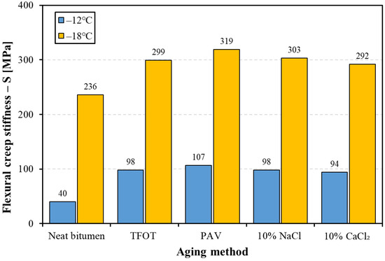 The low-temperature properties of bitumen were evaluated using flexural creep stiffness (S), stress relaxation ability (m-value), and limited temperature and shown in Figure 6 and Figure 7, and Table 5, respectively. Figure 6 shows the flexural creep stiffness (S) of bitumen (at −12 and −18 °C) before and after aging. The higher the value of flexural creep stiffness, the greater the bitumen stiffness. As seen from Figure 6, it was found that bitumen after four kinds of aging methods presented different increments on S values at a low temperature, arranging the S values of four kinds of aged bitumen in descending order: PAV aged bitumen, 10% NaCl aged bitumen, TFOT aged bitumen, and 10% CaCl2 aged bitumen. These results indicate that both thermal-oxidative aging and salt solution aging would lead to stiffer bitumen at a low temperature, while salt solution aging has a similar effect on the flexural creep stiffness of bitumen with TFOT aging (short-term aging).