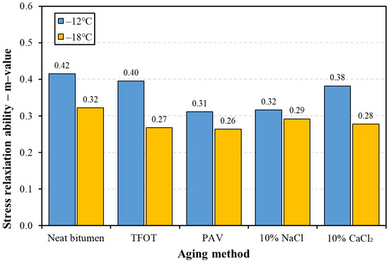 Figure 7 presents the stress relaxation ability of bitumen versus the aging method at −12 and −18 °C. The higher the m-value, the stronger the stress relaxation ability [36]. It could be found that the m-value of bitumen at −12 °C was higher than that at −18 °C, which indicates that bitumen tends to relax more stress at higher temperatures. It is noted that four kinds of aging methods decreased the m-value of bitumen to different extents, arranging the m-value of five kinds of bitumen in descending order: at −12 °C: neat bitumen, TFOT aged bitumen, 10% CaCl2 aged bitumen, 10% NaCl aged bitumen, and PAV aged bitumen; at −18 °C: neat bitumen, 10% NaCl aged bitumen, 10% CaCl2 aged bitumen, TFOT aged bitumen, and PAV aged bitumen. These results indicate that both thermal-oxidative and salt solution aging would decrease the ability of bitumen to relax stress. PAV aged bitumen had the worst ability to relax stress at two temperatures. TFOT aged bitumen had worse stress relaxation ability at −18 °C and better relaxation ability at −12 °C compared to salt solution aged bitumen. The different orders in the relaxation ability of salt aged bitumen and TFOT aged bitumen at −12 and −18 °C could be attributed different mechanisms of salt solution aging and TFOT aging.
