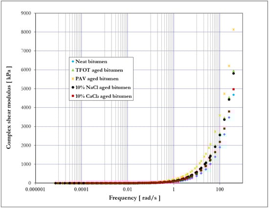 The complex shear modulus of bitumen before and after aging is shown in Figure 8. Both thermal-oxidative aging and salt solution aging increased the complex shear modulus of bitumen, especially at a higher frequency (lower temperature). These results indicate that both thermal-oxidative aging (TFOT and PAV) and salt solution aging (10% NaCl and 10% CaCl2) would improve the stiffness of bitumen, and the improving degree of four aging methods is arranged in descending order: PAV aging, TFOT aging, 10% NaCl aging, and 10% CaCl2 aging. It is worth noting that the difference between aged bitumen and neat bitumen in complex shear modulus increased over frequency, which indicates that the aging process has a more significant effect on the stiffness of bitumen at a high frequency (low temperature) than at a low frequency (high temperature).