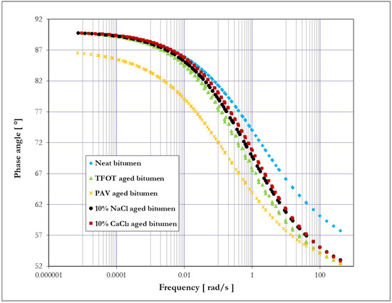 Considering the effect of aging on phase angle seen from Figure 9, bitumen showed different reactions on phase angle compared to complex shear modulus. TFOT, 10% NaCl, and 10% CaCl2 aged bitumen presented little changes in phase angle at a low frequency (high temperature) compared to neat bitumen, while they presented large differences in phase angle at a high frequency (low temperature). The above results demonstrate that salt solution aging has a similar effect on bitumen viscoelasticity to TFOT aging. These three aging methods primarily influence the low-temperature properties of bitumen, resulting in a better elastic response of bitumen at a high loading frequency (low temperature). Meanwhile, TFOT aging improved the elastic response of bitumen more than salt solution aging at a high frequency (low temperature). However, a better elastic response of bitumen at a low temperature would cause more risks of cracks, which is regarded as a deterioration of the low-temperature properties of bitumen. Therefore, both TFOT and salt solution aging thus deteriorated the low-temperature properties of bitumen, while TFOT aged bitumen presented slightly worse low-temperature properties of bitumen compared to salt solution aging. These results are consistent with the results from the BBR test. In addition, PAV aging had a dramatic effect on the phase angle of bitumen, resulting in a totally smaller phase angle of bitumen over frequency compared to neat bitumen. This phenomenon demonstrates that PAV aging leads to a better elastic response of bitumen, regardless of frequency or temperature. Additionally, PAV aged bitumen showed a similar phase angle with TFOT, 10% NaCl, and 10% CaCl2 aged bitumen at a high frequency. This fact means that PAV aging has a similar effect on the elastic response of bitumen to the other three aging methods at a high frequency.