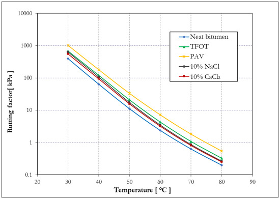 Additionally, the failure temperature was calculated as the critical temperature at which the rutting factor (at 10 rad/s) was equal to 1 kPa and is shown in Table 6. The failure temperature of bitumen determines the temperature at which the bitumen fails, so it is regarded as a factor indicating high-temperature stability [41]. Aged bitumen showed a higher failure temperature than neat bitumen, which means that aged bitumen is less prone to failure and the aging has a positive effect on the stability of bitumen at a high temperature. Comparing four kinds of aging methods, PAV aging caused the most significant effect on the failure temperature of bitumen, followed by TFOT aging, and NaCl aging; 10% CaCl2 had the smallest effect on failure temperature.