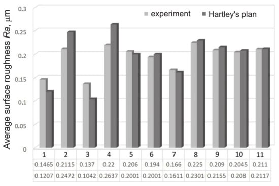 The results of Hartley’s plan show that the random factor F obtained did not exceed the critical value Fkr for the adopted level of significance α = 0.05. Therefore, the regression Equation (6) can be considered adequate. Hartley’s function reaches a minimum when Ra = 0.1042 μm (Figure 2), which corresponds to the experimental burnishing parameters ensuring the lowest value of the shaft surface roughness. In experiments no. 1–4, the relative error ranges from 18–24%, while in the remaining tests the error value does not exceed 3%.
