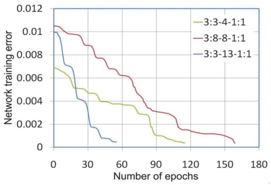Due to the very high tendency of the back propagation algorithm, it is recommended that the learning algorithm be stopped when the network error decreases no further [48]. Training of network 3:3-13-1:1 was stopped after 1180 epochs at the network error level of 0.0059 (Figure 5). The asymptotic nature of the course of changes in the value of the network training error proves that the minimum error value was reached. The training of the remaining networks was stopped at the same error value, although the course of the changes in network error during learning tends to further minimize the error. The increase in the number of neurons in the input layer, by introducing additional interneural connections, ensured faster convergence of the learning algorithms that were analysed. The observation of changes in the network learning error is a response to a possible network overtraining. Apart from the network training error, very important parameters indicating the network approximation abilities are the root mean square error, coefficient of determination and mean absolute error.