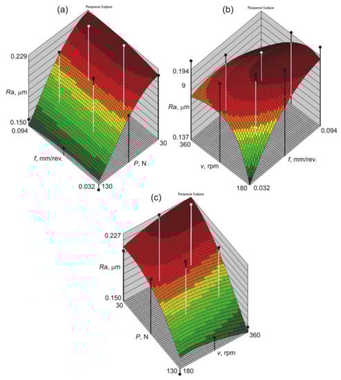 In general, reducing the feed rate at low burnishing speed decreases the Ra parameter of the shaft surface (Figure 6b). Reducing the impact force of the burnishing tool at a constant value of burnishing speed ensures a reduced roughness of the shaft surface (Figure 6c). At small values of the impact force of the burnishing tool, the increase in the burnishing tool led to a slight increase in the surface roughness parameter Ra. At high values of impact force there is the opposite relationship between burnishing speed and surface roughness. However, there are complex interactions between feed rate and burnishing speed. Higher values of the Ra parameter occur with a combination of high feed rate and low burnishing speed. The increase of the feed rate in the range of 180–200 mm/min while maintaining a constant burnishing speed initially led to an increase in the distance between the burnishing passes and therefore surface roughness increases. A further increase in burnishing speed causes a closeness of adjacent burnishing passes and, as a result, average surface roughness Ra decreases. This phenomenon was also observed by Ibrahim [51] and Dwivedi et al. [54]. Higher roller burnishing speed increases the surface temperature of a workpiece [54,55] and the material forming the asperities is more susceptible to plastic deformation.