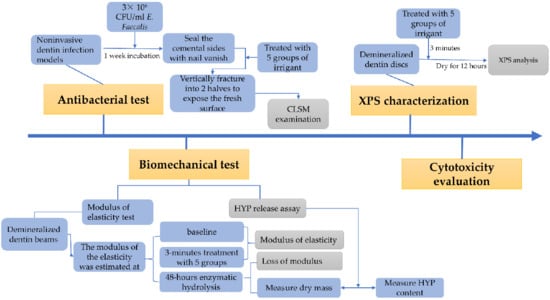 Root canal treatment is the method of choice for treating oral diseases associated with pulp and periapical infection. Endodontic microsurgery is often the last option to resolve persistent lesions with etiology related to complex root canal anatomy when non-surgical treatment is not effective [1]. The success of these endodontic treatments mainly relies on the thorough chemo-mechanical debridement of the infected root canals through the effective use of disinfectants and instrumentation, followed by sealing the enlarged, disinfected canals with appropriate root filling materials [2]. However, the bacterial elimination efficacy of root canal treatment is often compromised due to various reasons, such as untouched residual debris, and incomplete root canal filling that would allow secondary bacterial colonization [3,4,5]. In an ocean of failure cases, Enterococcus faecalis (E. faecalis) has been reported to present in the root canal as a biofilm alone or as the predominant bacterial specie [6,7,8]. In this regard, besides meticulous instrumentation, auxiliary endodontic medicaments (e.g., calcium hydroxide) and irrigants (e.g., sodium hypochlorite) with antibacterial activity are adopted by clinicians during root canal treatment, in order to disinfect the canal system and prevent reinfection. However, the risk of using these disinfectants is that they will cause changes in the chemical composition of the dentin (e.g., the biodegradation of demineralized dentin collagen) as long as disinfectants are applied in high concentrations for long periods [9,10]. In turn, these changes reduced the biomechanical properties of dentin, such as microhardness [11,12,13], flexural strength [14,15], modulus of elasticity [15,16], and the fracture resistance under normal masticatory loads. This is considered to be another risk factor for the root canal treatment failure. Therefore, endodontic disinfectants that kill E. faecalis whilst not compromising the biomechanical properties of dentin are in great demand [17,18,19,20].