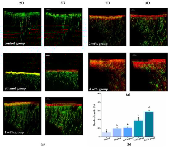 The bacteria penetration from the root canal to dentin tubules after centrifugation and the anti-biofilm effect of each irrigant against E. faecalis are shown in Figure 3. The histogram represents the death cell rate of E. faecalis biofilm that grew in infected dentin tubules. There were statistically significant differences between the experimental and the control groups (p < 0.05). Both the pure ethanol and quercetin solutions showed obvious anti-biofilm effects, and as the concentration of the quercetin solution increased, the proportion of dead volumes of E. faecalis raised from 19.13% to 57.8%, with a statistically significant difference (p < 0.05). The 4 wt% group (57.8%) showed the strongest anti-biofilm activity (p < 0.05).