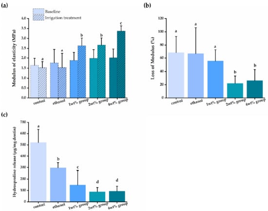 (a) The elastic modulus (MPa) of demineralized dentin beams at baseline, after irrigant treatment; (b) the loss of modulus (%) of demineralized dentin beams after collagenase degradation compared to dentin beams treated by different irrigants; (c) the released HYP (μg/mg dentin) from dentin treated by different irrigants and challenged by collagenase. Groups with the same letters are not statistically different (p > 0.05).