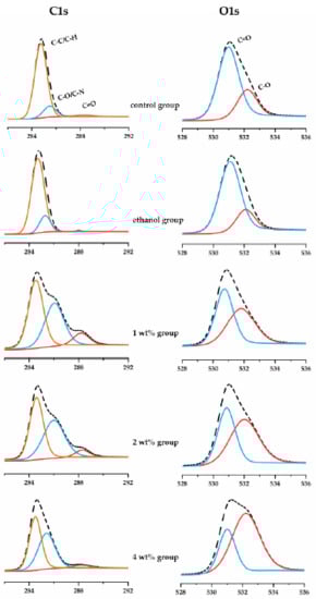 The XPS analysis characterized the chemical bonds of dentin collagen after quercetin biomodification as a surface-specific technique (Figure 5). The C1s spectra were curve-fitted into three main peaks at 284.7, 285.9 and 288.0 eV, which are associated with carbons in the aliphatic chain of amino acid side chains (C-C/C-H), carbons at the α-position of peptidic residues (C-O/C-N) and carbons in peptidic carbonyl and in carboxyl (C=O), respectively [39]. The O1s spectra exhibits two main peaks at 531.0 and 532.2 eV, which are dominantly attributed to the ketonic oxygen (C=O) and hydroxyl oxygen (C-O), respectively [40]. The detailed parameters of each peak of C1s and O1s spectra were listed in Table 1. Due to the abundance of hydroxyl groups in quercetin molecules, the C-O peak areas of both C1s and O1s spectra increased, in a quercetin concentration-dependent manner. The relative area of the C-O peak under C1s from in the quercetin groups increased from 13.0% to 46.4%, and the area of the C-O peak under O1s increased from 26.2% to 68.8%, which indicated that quercetin with abundant phenolic hydroxyls was grafted onto dentin collagen.