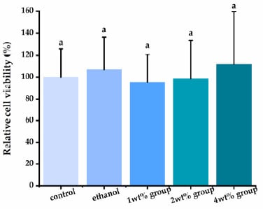 Using human dental pulp cells, we investigated the cytotoxicity of quercetin solution (Figure 6). Following a 24-h exposure, the quercetin irrigants presented acceptable cytotoxicity compared with the control group (p > 0.05), even at the highest concentration tested.
