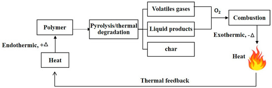 Understanding the combustion mechanism provides the basis of implementing an efficient flame retardant. The key contributors for the combustion process are fuel, oxygen, source of heat and chain reaction. Polymer combustion cycle starts by heating the flammable substrate till pyrolysis temperature. During pyrolysis, thermal degradation takes place and the material begins to depolymerize to unstable radicals and volatile gases. In the presence of enough oxygen and an ignition source, these volatile products act as fuel and combustion occurs. During combustion phase, toxic gases, smoke and heat are evolved. This released heat acts as a thermal feedback for further pyrolysis [13]. The combustion cycle is sustained by two main reactions, the endothermic reaction represented in thermal degradation and recycling the heat released during the exothermic reaction in the combustion phase [19,20]. Figure 1 represents a schematic diagram for the combustion process.